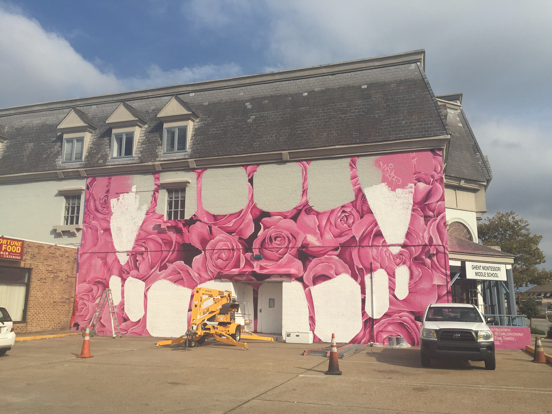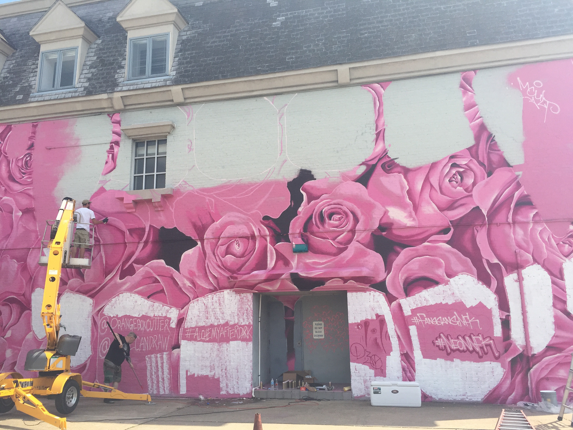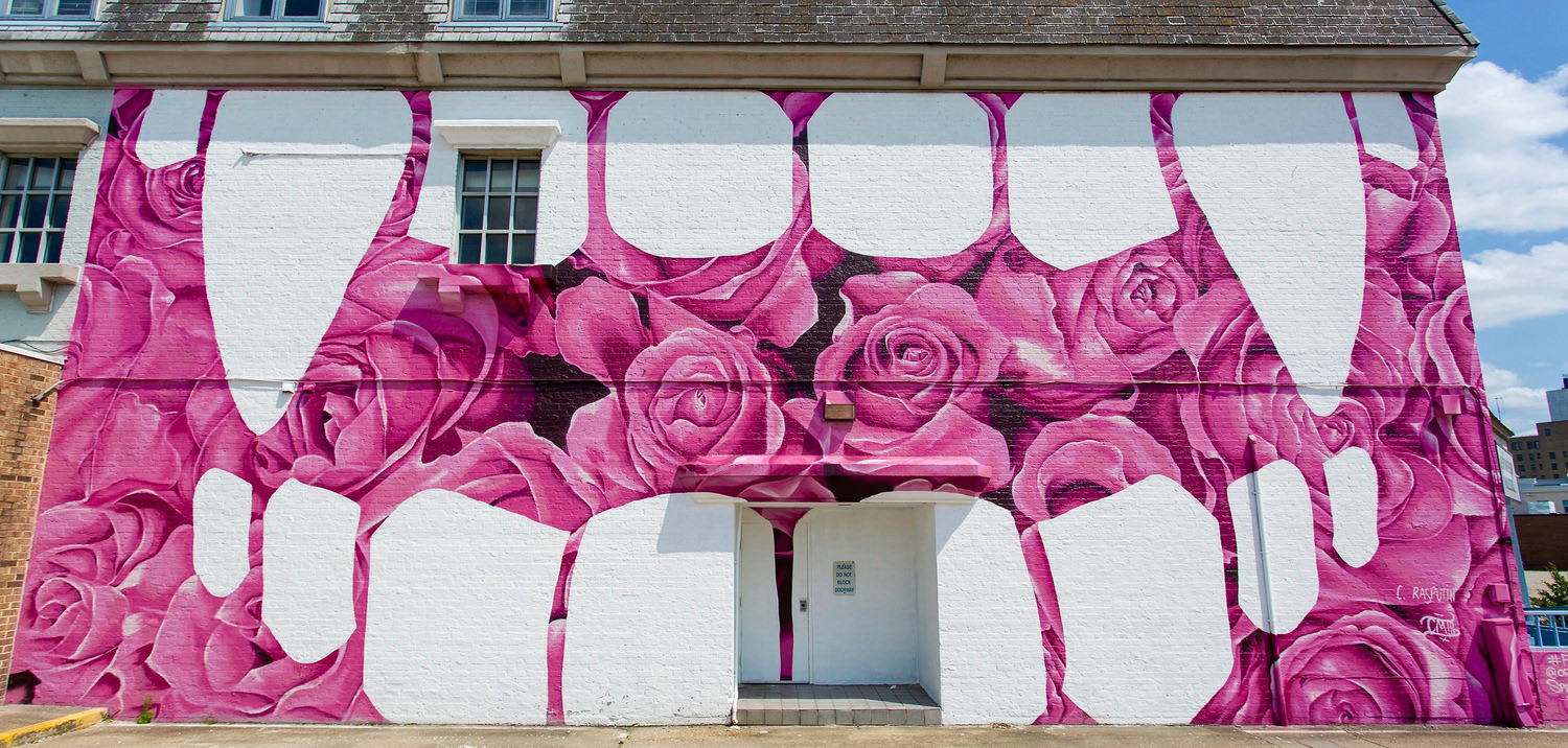 Bloom. 2015, 60'x30' Spray paint and exterior latex paint on brick. Completed along with artist