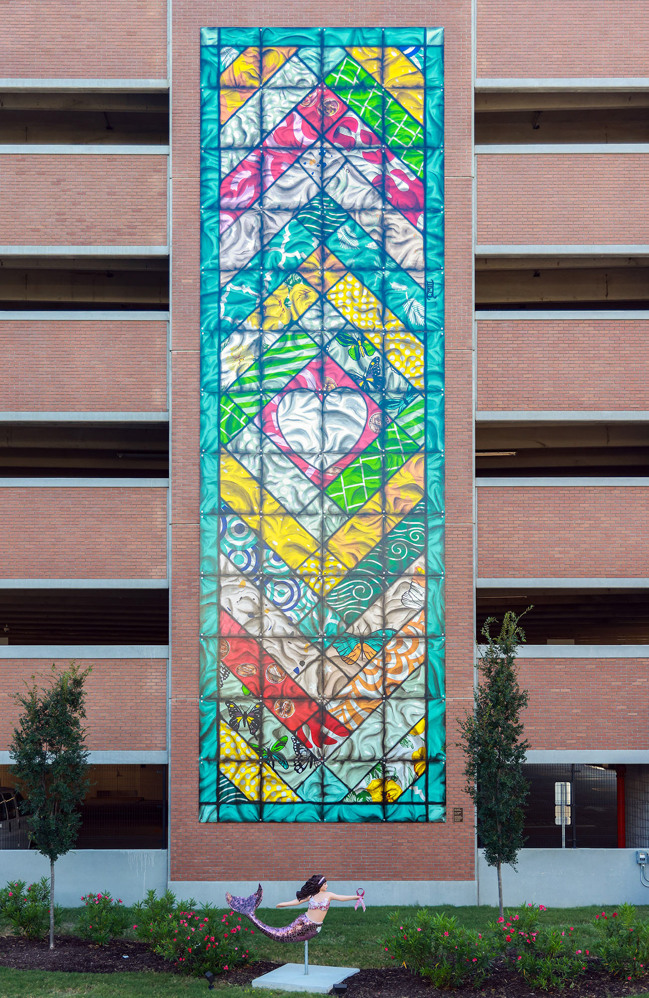 Cindy's Quilt. 2022, 16'x52' Exterior acrylic paint on MDO board. Created for the Sentara Brock Cancer Center in Virginia Beach, VA.