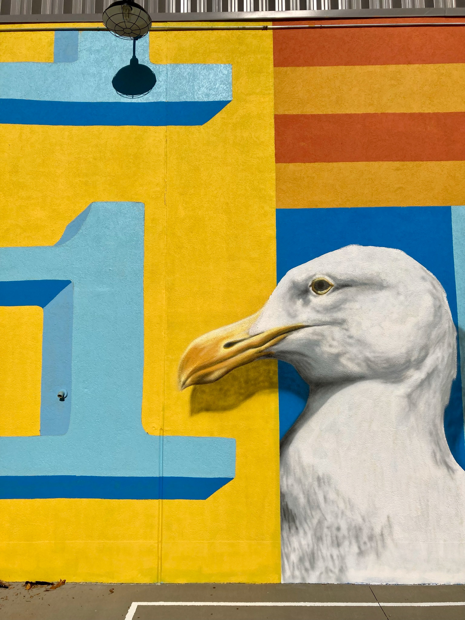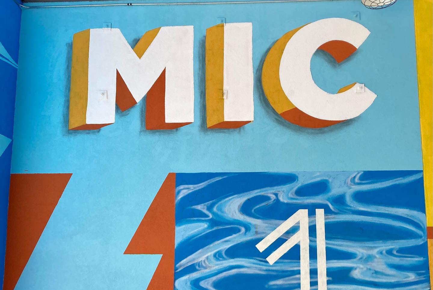 Mic Check. 2021, 60'x17' Spray paint and exterior latex paint on wall. Created for a renovated backstage area at the Veterans United Home Loans Amphitheater in Virginia Beach, VA.