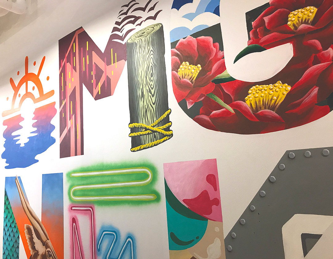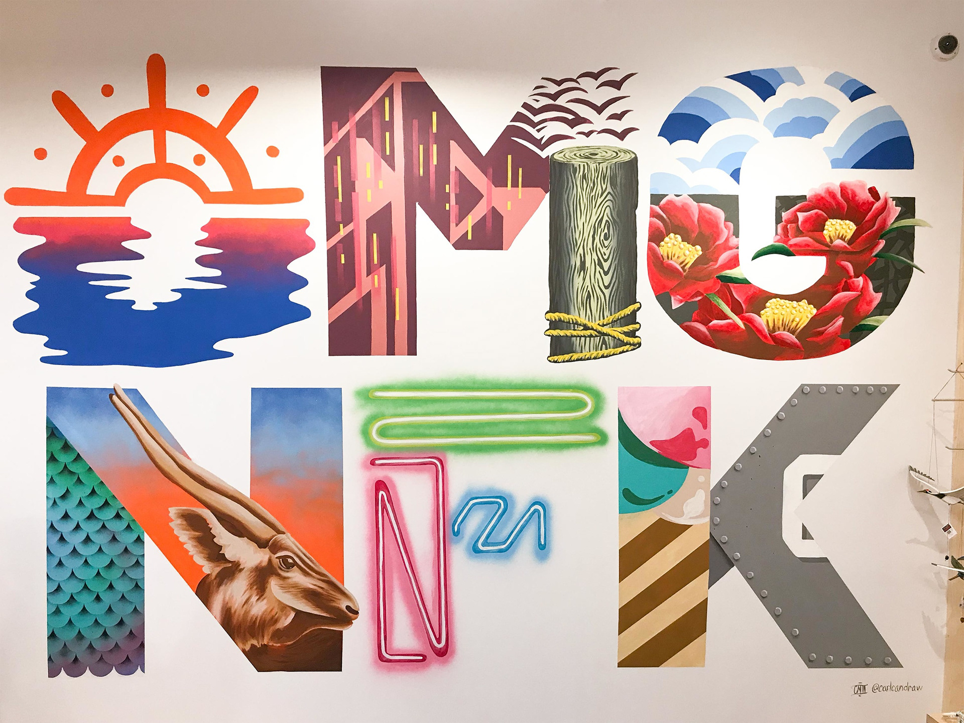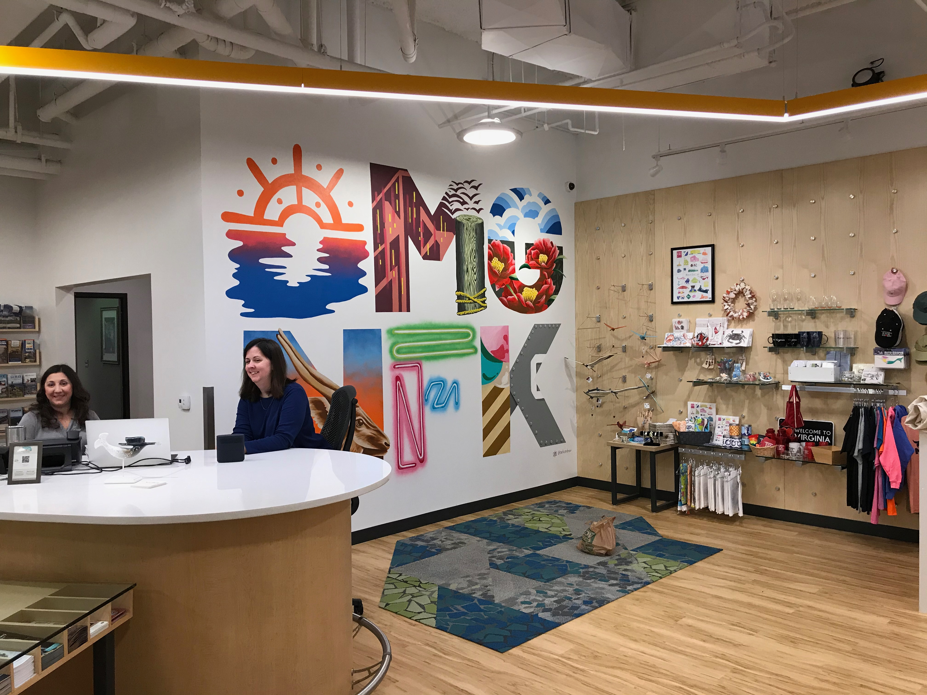 OMG NFK. 2019, 12'x10' Spray paint and interior latex on drywall. Created for the Norfolk Convention & Visitors Bureau at their new Information Center in Norfolk, VA.